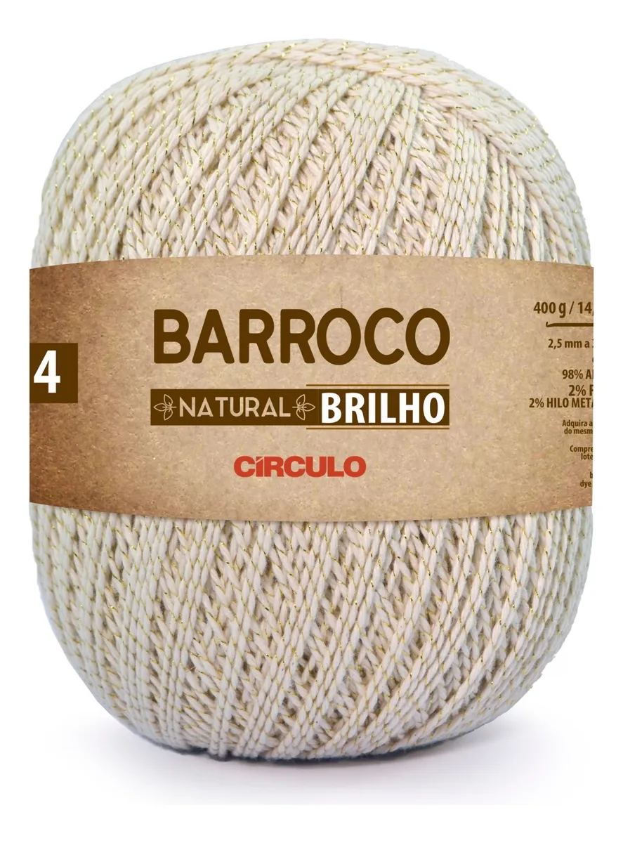 Criado para complementar a família Barroco, o fio *Barroco Natural brilho* tem toque e maciez incomparáveis. Disponível em diferentes espessuras nas versões Brilho Ouro e Brilho Prata, possui 98% algodão e 2% fibra metalizada em sua composição. Com Barroco Natural Brilho suas peças terão ainda mais qualidade e rendimento.